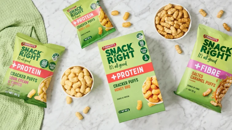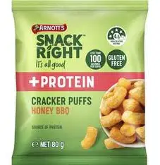 Arnott’s Snack Right +Protein Cracker Puffs Honey BBQ is a flavoured baked snacks. A source of protein, gluten free and has less than 100 calories per serve.
